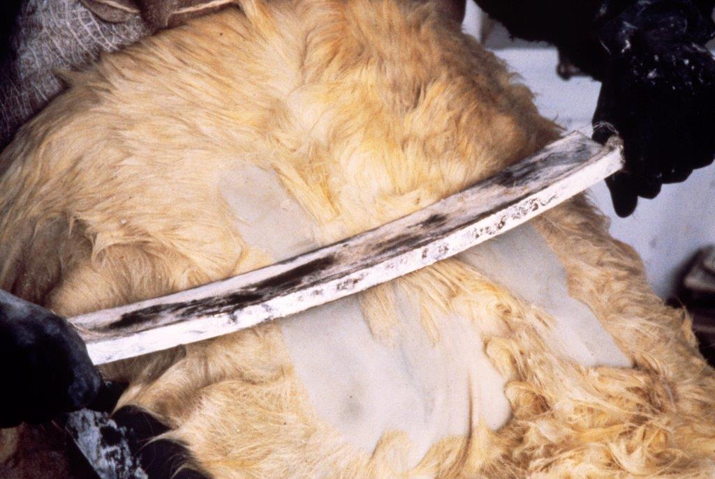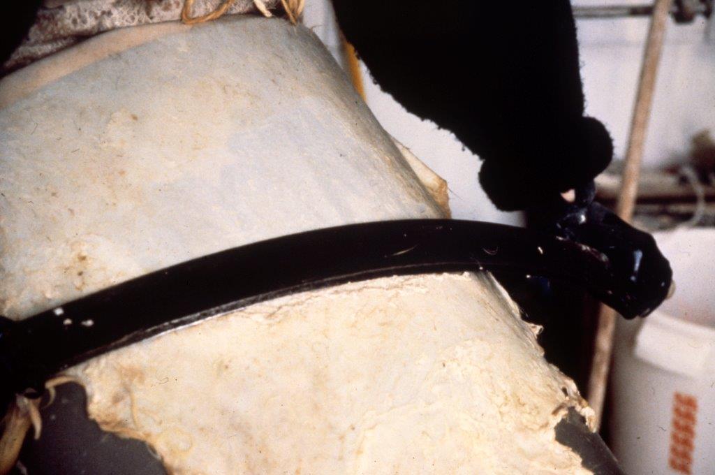 Na een paar dagen drogen kan de krijtlaag met de vliezen waaraan het krijt zich gehecht heeft, met het scherpe halvemaansmes worden afgeschraapt.