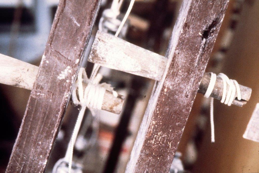 Deze hebben aan de achterzijde een gleuf waar een touw, met aan het einde een knoop, in vastgrijpt. Door de pennen te draaien kunnen de touwen en daarmee de huiden op iedere gewenste spanning gebracht worden. Het opspannen van een met kalk bewerkte huid is essentieel voor Het maken van perkament:, omdat de huid anders keihard zou worden. We kunnen dat zien in dierenwinkels waar repen halfdoorzichtig perkament in de knoop gelegd, als knauwbot voor honden verkocht wordt. Door de huid te spannen krijgt hij de karakteristieke gelaagdheid van perkament. De huidvezels komen in een tweedimensionaal vlak te liggen. Deze kompakte, door de vele bewerkingen gezuiverde massa geeft perkament zijn stugheid.