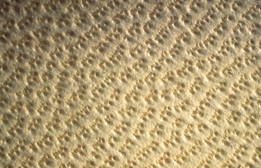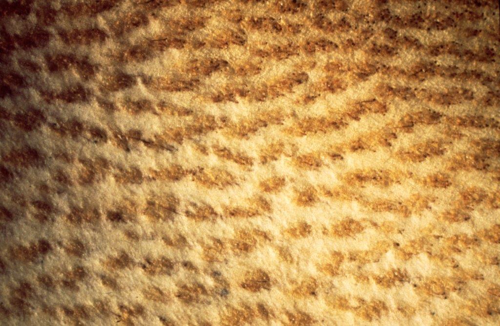 Vergroting van schapenperkament, De haren van een schapenhuid liggen in bosjes van enkele grote en kleine haren. Hierdoor worden groepjes bobbeltjes in de huid gevormd die ketens vormen. Dat patroon is ook zichtbaar wanneer alle haarresten verwijderd zijn.