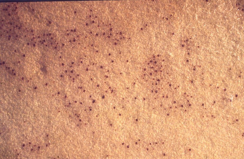 Vergroting van kalfsperkament. Hier liggen de haarresten als zwarte puntjes zonder patroon verspreid in het perkament. De nerf van het kalfsperkament heeft geen karakteristieke tekening. Het is als ivoor zo glad en heeft ook een gelijke kleurverdeling.