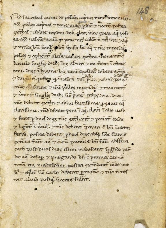 'Om op Bolognese wijze uit geitenvellen perkament te maken. Neem geitenvellen (1) en laat ze een dag en een nacht weken in water (2). Haal ze er dan uit en spoel ze tot het water helder blijft. Maak een heel nieuw bad van niet al te verse kalk en water en meng dit heel goed door elkaar zodat het een dikke vloeistof wordt. Doe de huiden erin, aan de vleeszijde samengevouwen. Roer twee- of driemaal per dag met een stok, gedurende acht dagen en 's winters tweemaal zo lang (3).